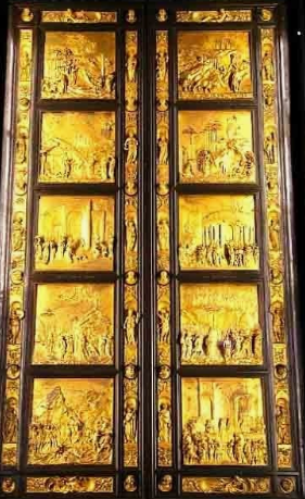 힐데스하임 대성당의 청동 문(기원후 1015년경)은 창세기와 예수 생애를 주제로 한 부조로 장식되었습니다. 굵고 단순한 선은 중세 초의 소박함을 반영하며, 신앙 교육의 도구로 사용되었습니다.
