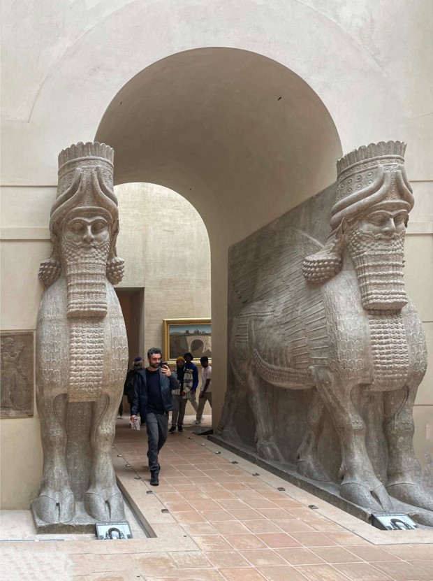 니네베 궁전에서 발견된 부조(기원전 645년경)는 아슈르바니팔 왕이 사자를 사냥하는 장면을 묘사합니다. 석회석에 새겨진 이 작품은 동물의 근육과 움직임을 생동감 있게 표현하며, 왕의 용맹함을 강조했습니다. - 날개 달린 황소 (기원전 710년경)